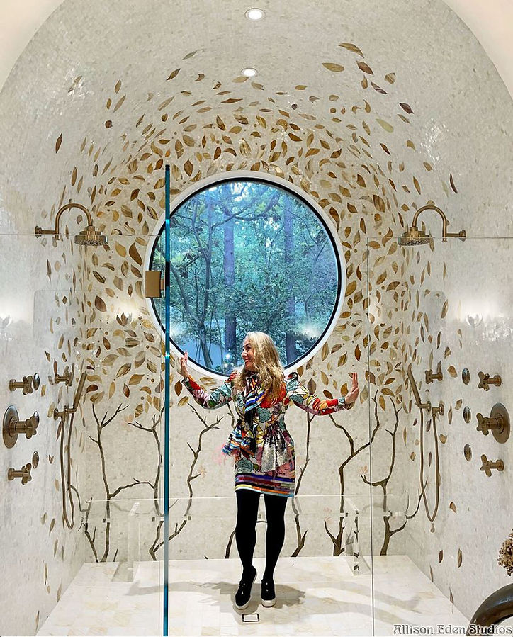Nestled within a spacious double shower boasting a soaring vaulted ceiling, a captivating scene unfolds. A stunning stained glass mosaic tile, depicting swirling leaves and graceful tree branches, envelops a circular picture window at the shower's focal point. This intricate artwork not only adds a touch of natural beauty but also infuses the space with a sense of tranquility and artistry, transforming the shower into a serene sanctuary where the outside world meets luxurious comfort. Hand crafted by Allison Eden Studios of Brooklyn installed in Buckhead, GA.