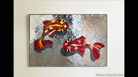 This mesmerizing stained glass and mirror mosaic artwork captures the graceful movement of twin koi fish swimming in harmony. Using a bold interplay of vibrant stained glass hues, the koi appear to float above a herringbone sea of rippling silver mirror, creating a striking 3D illusion of motion and shadow.